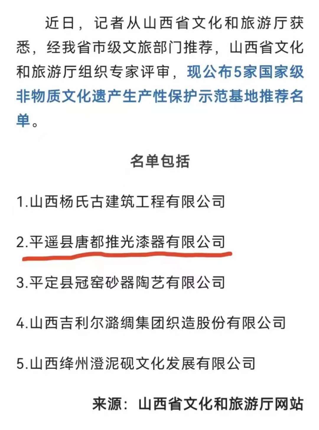 近日,根據(jù)《文化和旅游部辦公廳關(guān)于開展國家級非物質(zhì)文化遺產(chǎn)生產(chǎn)性保護示范基地推薦工作的通知》,經(jīng)市文旅部門推薦,山西省文化和旅游廳組織專家評審,平遙唐都推光漆器有限公司入選“國家級非物質(zhì)文化遺產(chǎn)生產(chǎn)性保護示范基地”推薦名單。