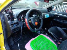 圖為方向盤上張貼有黨徽而干凈整潔的出租汽車駕駛室 圖為在藍(lán)天白云下風(fēng)景如畫的車檢現(xiàn)場(chǎng)