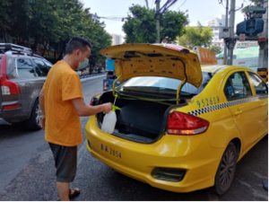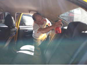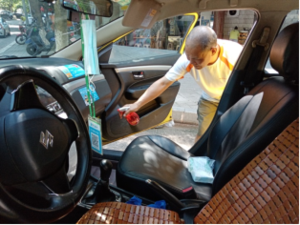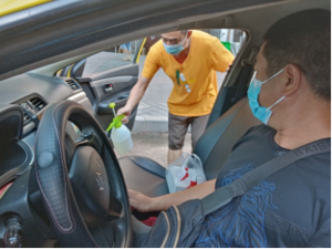 圖為公司一駕駛員正在對車內(nèi)進行消毒