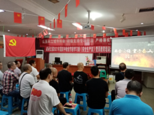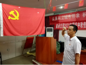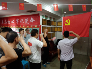 圖為支部黨員同志們正在為新黨員張勇同志進(jìn)行入黨宣誓和老黨員重溫入黨誓詞。
