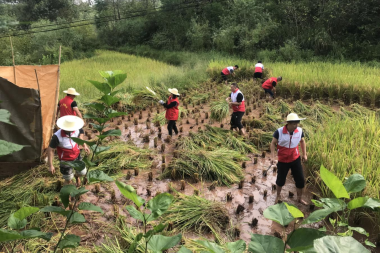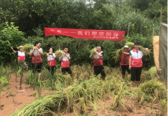 當(dāng)日一早,大家來到新橋村低保戶倪國華的家中,為老人送去牛奶、食用油等慰問品,隨后立即奔向田間地頭。大家躬下身子、卷起褲腳,爭先恐后搶收稻谷,割谷、脫谷、挑谷、曬谷,一身泥、一身汗,分工合作,相互協(xié)作,心中想著為老人減少損失,減輕負(fù)擔(dān)。