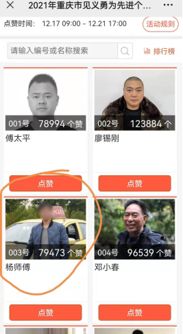 發(fā)表時(shí)間:2021-12-20 14:30作者:李嘉男來(lái)源:的士報(bào) 為營(yíng)造崇尚見(jiàn)義勇為精神、關(guān)愛(ài)見(jiàn)義勇為英雄的社會(huì)氛圍,近日,由重慶市人民政府主辦,中共重慶市委政法委員會(huì)、重慶市公安局承辦,重慶市見(jiàn)義勇為基金會(huì)協(xié)辦的“2021重慶市見(jiàn)義勇為先進(jìn)個(gè)人(群體)評(píng)選活動(dòng)”啟動(dòng)。從12月17日起至12月21日17時(shí),廣大網(wǎng)友可為見(jiàn)義勇為英雄點(diǎn)贊! 入圍見(jiàn)義勇為先進(jìn)評(píng)選活動(dòng)的,共8位候選個(gè)人和4個(gè)候選群體,他們從2020年—2021年全市各區(qū)縣涌現(xiàn)出的見(jiàn)義勇為人員群體中推薦產(chǎn)生。重慶市出租車行業(yè)無(wú)名英雄“楊師傅”榜上有名。 如何進(jìn)行點(diǎn)贊?據(jù)介紹,關(guān)注進(jìn)入重慶政法、****、重慶市見(jiàn)義勇為基金會(huì)微信訂閱號(hào)相關(guān)欄目,點(diǎn)擊資訊內(nèi)的選項(xiàng)即可參與投票。值得注意是,同一部手機(jī)微信賬號(hào),每天僅能參與一次點(diǎn)贊,每次點(diǎn)贊共計(jì)10票,可點(diǎn)贊同一候選人,也可點(diǎn)贊多位候選人。同時(shí),嚴(yán)禁任何形式的刷票行為;若發(fā)現(xiàn)有刷票或數(shù)據(jù)異常者,活動(dòng)組委會(huì)將取消其點(diǎn)贊票數(shù),情節(jié)嚴(yán)重者將追究其法律責(zé)任。