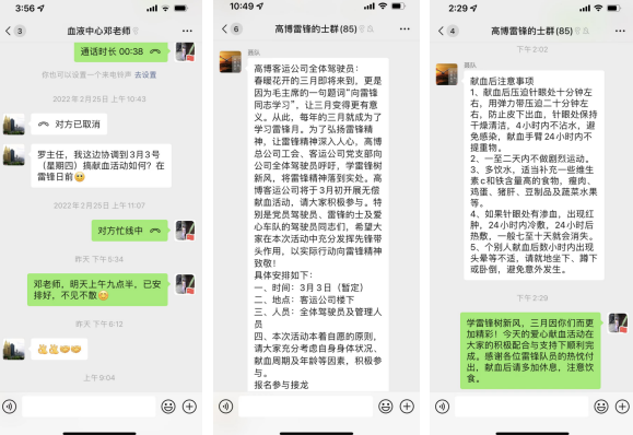 圖為愛心獻血活動實施過程中的微信記錄(活動時間確認、倡議書、活動注意事項等)