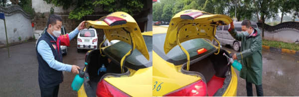 圖為優(yōu)秀雷鋒隊(duì)員正在對車輛進(jìn)行消毒(一)