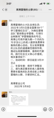 發(fā)表時間:2022-03-30 15:39作者:羅繼偉來源:高博 三月,是溫暖的,萬物復(fù)蘇的,充滿希望的三月。 2022年3月5日是全國第59個“學(xué)習(xí)雷鋒紀(jì)念日”。為響應(yīng)雷鋒總隊“愛崗敬業(yè)學(xué)雷鋒、引領(lǐng)行業(yè)樹新風(fēng)”學(xué)雷鋒服務(wù)的號召,高博公司積極開展形式多樣的學(xué)習(xí)雷鋒活動。動員公司全體出租車駕駛員朋友們,志愿參與為70歲及以上的老人提供免費乘車服務(wù)的愛心活動就是公司每年都提倡的學(xué)雷鋒活動之一。黨支部聶書記在黨員及雷鋒的士工作群中大力號召同志們充分發(fā)揮黨員及雷鋒的士隊員的道德模范榜樣作用,積極投入活動,弘揚雷鋒精神,倡導(dǎo)時代新風(fēng),踐行社會主義核心價值觀。 3月9日,聶書記將活動號召發(fā)布到公司所有工作群,高博全員上下一心,很快就有隊員為老人們提供了免費乘車服務(wù)。黨員駕駛員隆忠昇就是其中的一位。3月10日,隆忠昇駕駛渝A63T13出租車途徑南坪步行街附近,偶遇兩位老人。上車后,隆忠昇仔細(xì)詢問了老人們的目的地,叮囑老人們系好安全帶,帶好口罩之后,緩步驅(qū)車前往目的地。兩位老人性格開朗十分健談,經(jīng)過攀談了解到其中一位名叫周漢舫的老人今年已經(jīng)72歲,當(dāng)即告知對方本次乘車服務(wù)可以免費。起初,老人們還不相信,說哪有這樣的好事兒。隆師傅便將高博公司大力開展學(xué)習(xí)雷鋒活動的事宜簡單告知兩位老人,并表示自己是一名黨員駕駛員,更應(yīng)該在活動中發(fā)揮先鋒代表作用,積極參與愛心活動。聽到此,兩位老人喜笑顏開,好一番夸獎學(xué)習(xí)雷鋒好榜樣!