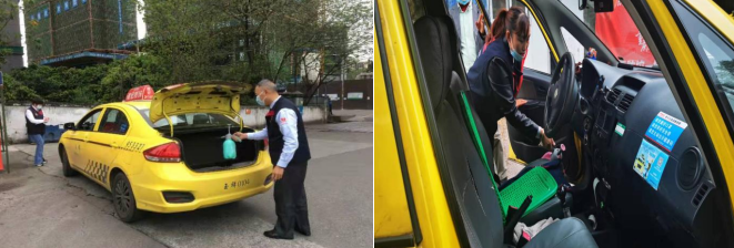 圖三、四 隊員們密切配合作業(yè) 4月4日,消毒作業(yè)現(xiàn)場,他們1人記錄、2人實施消毒,輪番作業(yè)、交替進(jìn)行,前來消毒的出租車輛駕駛員積極配合、依次排隊,