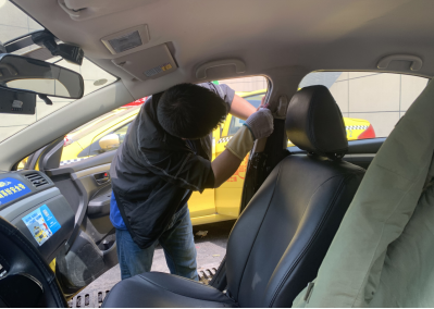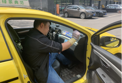 工作人員對出租車車廂及內(nèi)飾進行全面清洗