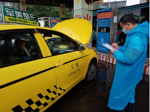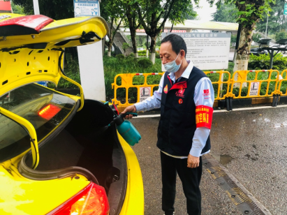 圖為人和加氣站隊員田宏祿同志正在對車輛進行消毒。