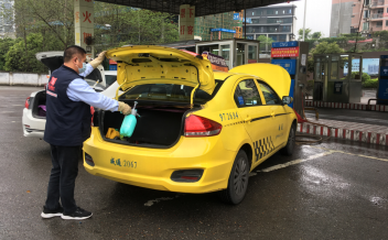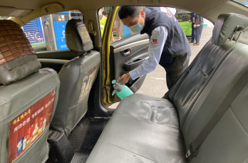 “雷鋒的士”公運(yùn)支隊(duì)隊(duì)員正在為出租車進(jìn)行全面消毒