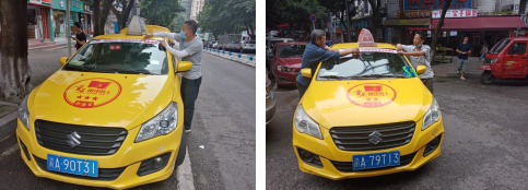 圖為雷鋒隊(duì)員正在對(duì)星級(jí)“雷鋒的士”創(chuàng)建車輛張貼高考送考標(biāo)識(shí) |