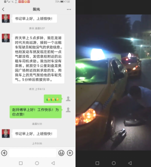 圖為王華倫師傅搭乘上婆婆乘客的微信信息截圖圖片 三事:6月3日早上5點(diǎn)多鐘時(shí)分,泉承大隊(duì)渝A79T13號(hào)優(yōu)秀雷鋒隊(duì)員趙加坤師傅駕駛著雷鋒的士巡游在龍湖時(shí)代天街路段時(shí),手機(jī)接收到一位駕駛員車輛左前輪胎漏氣急需救急的信息后,毫不猶豫立即調(diào)轉(zhuǎn)車頭向著駕駛員求救的盤龍奧園方向行駛?cè)ィ谮w師傅放空5公里來(lái)到故障出租車處,經(jīng)問(wèn)詢故障車輛駕駛員后,立即從自己車上拿出自己的隨車維修工具,電動(dòng)充氣泵,接上漏氣輪胎氣嘴,進(jìn)行電動(dòng)充氣,約5分鐘后,漏氣輪胎充滿了氣壓,出租車左前輪胎恢復(fù)了正常,受到了駕駛員的點(diǎn)贊和感謝!