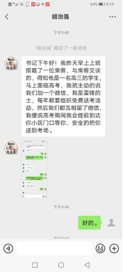 圖為趙師傅接收到駕駛員求救信息和對(duì)車輛進(jìn)行充氣截圖圖片 四事:2022年端午節(jié)時(shí)值2022年高考送考時(shí)機(jī),今年因出協(xié)總隊(duì)沒(méi)有對(duì)泉承大隊(duì)安排高考送考任務(wù),優(yōu)秀雷鋒隊(duì)員們感到非常著急,但是大家沒(méi)有等待,而是主動(dòng)出擊,通過(guò)多種方式和渠道努力找尋著考生送考信息:優(yōu)秀雷鋒隊(duì)員王華倫同志率先找尋到一位考生送考信息;隨后優(yōu)秀雷鋒隊(duì)員趙加坤、葉未相繼找尋到考生送考信息;最感幸運(yùn)的是優(yōu)秀雷鋒隊(duì)員胡治強(qiáng)師傅,他在搭乘上一位看似考生模樣的乘客,胡師傅就主動(dòng)熱情地向這位乘客問(wèn)詢到。果不其然,通過(guò)主動(dòng)熱情問(wèn)詢得知這位乘客就是一名考生后,胡師傅熱情地向這位考生宣傳到自己是一名重慶“雷鋒的士”參加車輛雷鋒隊(duì)員,在高考期間我會(huì)溫馨、安全、免費(fèi)搭乘你前往考點(diǎn)參加高考,同時(shí)與這位考生相互添加了微信,并熱情地向這位考生承諾,自己一定在高考期間,提前到達(dá)你的居住地小區(qū)門口,等待你乘車,安全將你送達(dá)考點(diǎn),受到這位考生的連聲感謝和點(diǎn)贊!