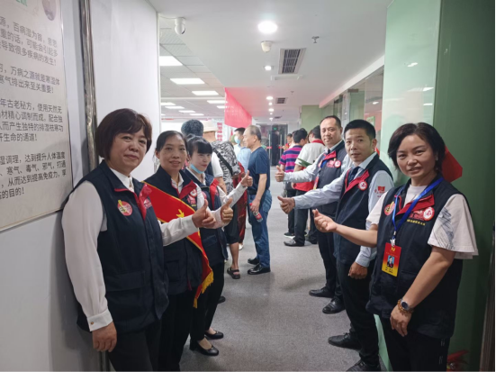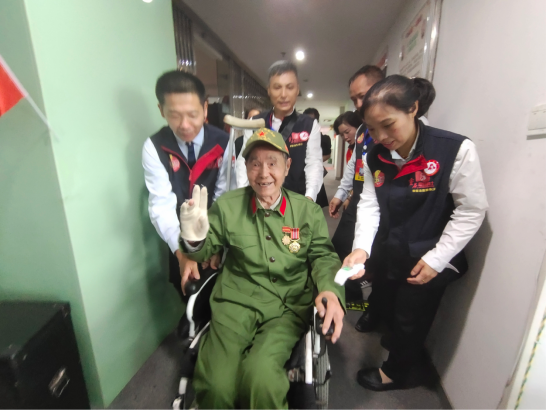 “雷鋒的士”乘客服務(wù)隊(duì)隊(duì)員們幫助殘疾老兵推輪椅