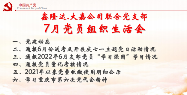 發(fā)表時間:2022-07-27 10:22作者:馮祥模來源:鑫隆達 重慶鑫隆達大嘉公司聯合黨支部,針對7月以來,城區(qū)出現連晴高溫和當前重慶新冠疫情防控的具體要求,順應形勢變化,七月份黨員組織生活采取線上學習的方式進行。