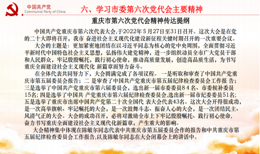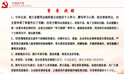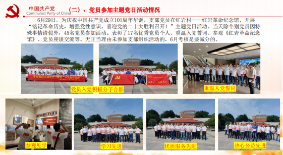 圖二 通報支部開展黨性教育主題活動情況 其次,講評了慶“七一”主題黨日活動情況。6月29日,鑫隆達大嘉公司全體黨員和入黨積極分子在紅巖村——紅巖革命紀念館開展“銘記革命歷史,增強黨性意識,喜迎黨的二十大勝利召開!”主題黨日活動。當天參加活動的同志能主動配合、積極參與,嚴守外出紀律、服從現場管理,現場參觀活動井井有條,在召開黨員座談交流會時,大家積極發(fā)言、交流思想真誠,剖析問題基本準確,達到了黨性教育的目的。對個別未參加的同志提出嚴厲批評,希望全體同志一定要加強自律、積極參與集體活動,講黨性、守規(guī)矩。 圖三、四 貫徹市委六次黨代會精神 第三 會議通報了6月份支部黨員“學習強國”積分、本支部在行業(yè)黨委“學習強國”排名以及支部黨員日常教育管理考核成績情況。對表現突出的同志予以口頭表揚,對學習成效不明顯、參加公益不主動的同志提出嚴肅批評。 會議要求全體黨員同志:一定要主動通過“學習強國”學習平臺,加強自身政治理論學習,特別是黨的十九屆歷次會議精神、習近平新時代中國特色社會主義思想理論等創(chuàng)新理論,用黨的創(chuàng)新理論武裝頭腦,政治上思想上行動上,必須與黨中央保持高度一致,在實際工作中,切實增強“四個意識”、堅定“四個自信”、用實際行動做到“兩個維護”。 第四以市委第六次黨代會精神,助推企業(yè)高質量發(fā)展。重點學習了市委陳敏爾同志代表中共重慶市第五屆委員會,做的《沿著習近平總書記指引的方向堅定前行,推動高質量發(fā)展、創(chuàng)造高品質生活,奮力書寫重慶全面建設社會主義現代化新篇章》主題報告。全會審議并通過了陳敏爾書記的工作報告,與會代表對五屆市委的工作給予高度認可,對市委五年來團結帶領全市人民經過不懈努力奮斗,所取得的成績和工作予以高度評價。大會一致認為, 陳書記報告通篇體現了堅決擁護“兩個確立”、做到“兩個維護”的鮮明態(tài)度。市委第六次黨代會通篇貫穿了把習近平總書記殷殷囑托全面落實在重慶大地上這條主線, 明確了今后五年發(fā)展思想目標,號召全體黨員干部一定要緊扣中央精神,結合重慶實際,順應全市人民群眾期盼,奮力書寫推動高質量發(fā)展、創(chuàng)造高品質生活新篇章;奮力書寫建設內陸開放高地、山清水秀美麗之地新篇章;奮力書寫成渝地區(qū)雙城經濟圈建設新篇章。強調指出:未來五年,全市要努力實現六方面目標: 經濟實力顯著提升,科教實力顯著提升,城市綜合實力顯著提升,生態(tài)文明建設水平顯著提升, 社會治理水平顯著提升,人民生活水平顯著提升。本次會議是一次為全面建設重慶現代化西部大都市動員令,是貫徹落實黨中央決策部署的重要會議,具有極強的政治性、時代性、實踐性,在新奮進時代、開啟新征程上,動員和激勵全市各級黨員干部、人民群眾沿著習近平總書記指引的正確方向堅定前行, 推動高質量發(fā)展,創(chuàng)造高品質生活, 為書寫重慶全面建設社會主義現代化新篇章而努力奮斗, 具有十分重要的長遠意義和現實意義。 作為交通參與者的巡游出租汽車服務企業(yè),一定要站在講政治、顧大局、識大體,服從并服務于川渝雙城經濟建設,抓住我市全面建設現代化發(fā)展的大機遇,查找企業(yè)發(fā)展中存在的問題,對癥施策,因地制宜,從解放思想入手,順應現代信息技術發(fā)展需要,不斷強化法紀意識、不斷提升崗位技能,自覺踐行黨的宗旨意識、充分發(fā)揮支部戰(zhàn)斗堡壘作用和黨員先鋒模范作用,主動踐行新時代社會主義核心價值觀,文明誠信、主動作為,規(guī)范管理,助推企業(yè)高質量發(fā)展,為提升廣大市民高品質生活貢獻應盡力量,以實際行動迎接黨的二十大勝利召開! (圖/文 馮祥模) |