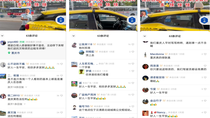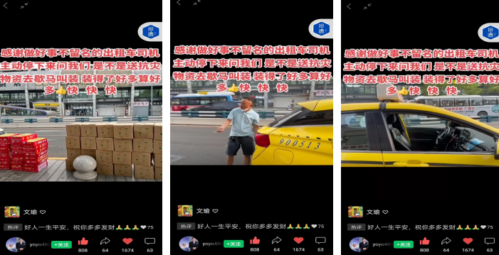 發(fā)表時間:2022-08-26 14:38作者:文 文瑜 圖 鄧濤來源:泉承 最近重慶天氣炎熱,持續(xù)的高溫天氣,很久都沒有下雨了,導(dǎo)致重慶很多地方,引來了山火。在這危難時刻,重慶很多熱心的市民,自發(fā)組織給眾多因大火燒山的地方送去他們的溫暖和愛心。有出人力的,有出物力的,大家都想為自己的家鄉(xiāng),自己的家園,自己土身土長的地方獻出自己的愛心,奉獻自己的力量,他們還會引響和帶領(lǐng)自己的身邊人,自己的團隊,為我們的家園救火抗災(zāi)。 8月22日,中午1點多鐘,泉承公司的駕駛員鄧濤,駕駛車牌渝AD92089(自編號900513),在路過北碚城南公交樞紐站對面的時候,發(fā)現(xiàn)路邊擺放了許多物資,有滅火器、防護手套和飲料等物品,鄧濤心想北碚區(qū)歇馬21號發(fā)生了大火燒山,今天肯定是群眾自發(fā)組織,對抗擊山火的消防官兵和去幫助救火的人民群眾募捐物資。 在此刻,鄧濤毫不猶豫主動的停下了車,打開了自己的后背箱,急忙對站在邊上的人大聲呼喊,快把物資裝進來,能裝多少,裝多少,不收費,快快快。因為鄧濤心口合一的這句話,和自己的實際行動,感動了當時在場的所有群眾和募捐方,大家都非常的感動。都豎起大拇指夸我們的出租車師傅好樣的,有血性,有擔當。鄧濤在協(xié)助他們裝好了救火物資后,快馬加鞭的送到了救火第一現(xiàn)場。 鄧濤,幫忙送完了物資,沒有留下自己的姓名,轉(zhuǎn)身就離開了,過了幾天才從朋友那里得知自己上抖音了,才知道自己幫助的是蝶資美容中心員工自發(fā)組織的捐贈品。 重慶有許多耿直人,有許多的好心人,有許多助人為樂的人,我們因為自己是重慶人而感到驕傲自豪。