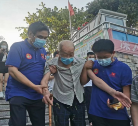 圖為王華倫在維護秩序和幫助老人下臺階