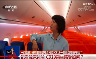 圖為央視記者在體驗(yàn)C919乘坐感受在C919首飛現(xiàn)場(chǎng) |
