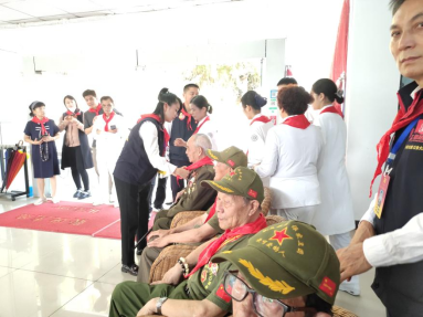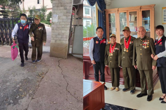 “雷鋒的士”乘客志愿服務隊隊員們為抗美援朝老英雄系紅領(lǐng)巾
