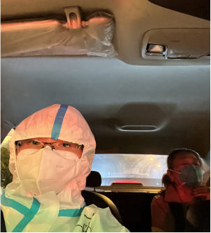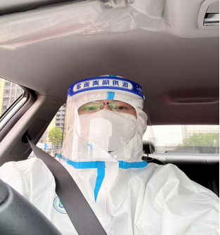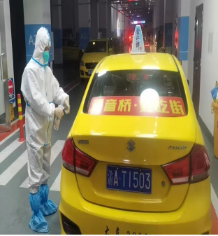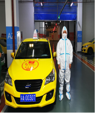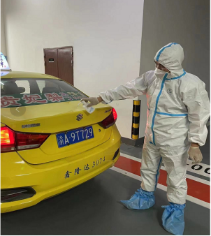 圖一、二 穿戴完畢準(zhǔn)備出車 隊(duì)員們每天穿戴好防護(hù)服、口罩、手套等防疫裝備,配備好消毒噴霧等應(yīng)急物資。連日來(lái)彭慶豐和隊(duì)友們駕駛著出租車迅速到達(dá)指