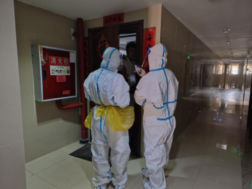 圖為:毛小華(右)協(xié)助醫(yī)護人員上門采集核酸,開展掃碼、登記等工作