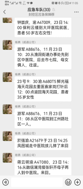 11月的重慶疫情日益加劇。15日,接上級部門要求,威通公司迅速反應(yīng),組建了巡游出租車25輛,分布于龍洲灣、魚洞、蓮花、李家沱和花溪街道,采取分區(qū)域統(tǒng)一調(diào)度的方式,擔(dān)起了解決就近市民的緊急出行的防疫任務(wù)。 于是,威通公司臨時組建的應(yīng)急車隊微信群開始熱鬧了起來,從凌晨到深夜,從深夜到凌晨,群里的回執(zhí)信息清晰的記錄著他們的“戰(zhàn)疫軌跡”: 曹照均,8點15分,從道角二村接孕婦去中醫(yī)院產(chǎn)檢; 於強,12點25分,從鳳圖城送摔傷小孩去中醫(yī)院緊急就醫(yī); 鐘崇慶,20點10分,從城南未來接骨折病人去中醫(yī)院就醫(yī); 鮮光福,9點,從大江轉(zhuǎn)盤接癌癥病人去衛(wèi)生服務(wù)中心就醫(yī),往返; 鄧世金,22點05分,從蓮花街道接人去中醫(yī)院透析……