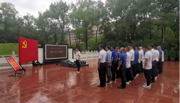 圖2:在烈士墓碑前,全體黨員面對(duì)黨旗重溫入黨誓詞 上午10時(shí)許,黨員們佩戴著小白花,緩緩前行到烈士墓前,軍姿列隊(duì)、莊嚴(yán)肅立,向烈士們集體默哀三分鐘,并向他們?nèi)瞎员硎緦?duì)先烈們的敬仰、悼念之情。最后,黨員們繞行烈士墓一周,獻(xiàn)上朵朵白花,再次向英烈們表達(dá)哀思之情。 通過參觀,黨員們百感紛呈,三百多志士英才血濺沙場,就義于新中國成立后,他們大多正直風(fēng)華正荗,本可在百廢待興的新中國一展雄韜偉略,卻在黎明前最黑暗的時(shí)間里飲恨奔赴酒泉。看著一個(gè)個(gè)英烈的名字和畫像,黨員們的靈魂再一次被深深地觸動(dòng),更加堅(jiān)定“不忘初心,牢記使命”的革命信念。