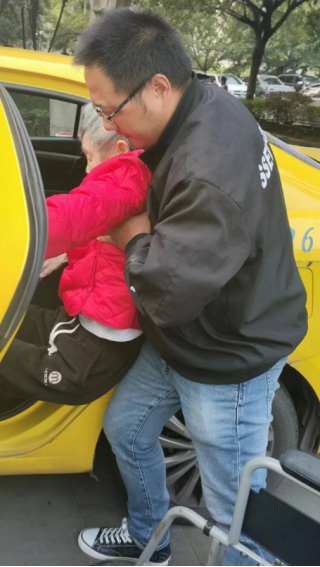 據(jù)楊女士講述,事情要追溯到2022年11月2日,她在龍洲灣金色田園小區(qū)樓下招停了我司渝A225T2出租車,開車的是張九龍師傅。當時,她請求張師傅在原地等一會兒,她要步行上7樓扶老人下來乘車去醫(yī)院。張師傅得知后趕緊靠邊停車,隨楊女士上了樓。 上樓過程中,張師傅與楊女士交談得知,老人已經(jīng)91歲了,幾天前不小心摔了一跤,導(dǎo)致腿痛無法站立。當房門打開的一瞬間,張師傅看見了輪椅上白發(fā)蒼蒼的老人,心里一陣心酸,他毫不猶豫地蹲在了老人面前堅定地說:“來,老人家,我背你下樓!”