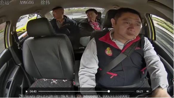 “公運出租”民豐車隊渝A995T6駕駛員徐偉車內(nèi)監(jiān)控視頻畫面截圖 |