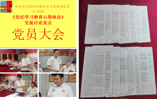 三、圍繞《黨紀教育心得體會》交流討論發(fā)言 在學習完黨課和條例后,在坐黨員、預備黨員、入黨積極分子、入黨申請人進行了深入交流討論,將自己6月所寫的心得體會同黨員們進行相互交流,共同學習,取長補短,以此汲取更多的理論知識,豐富自己的頭腦,堅定自身的思想意識,規(guī)范自身行為。用鐵的紀律嚴格要求自己,時刻保持忠誠、干凈、擔當。 在支部書記的組織下,大家爭相發(fā)言,但為保證,每一名支部同志撰寫的黨紀學習教育心得體會得到展示,支部書記則邀請除上次交流討論的黨員外,其余的黨員代表進行發(fā)言。此次發(fā)言有黨員王華倫、張勇、李勇,以及入黨申請人王偉。大家在發(fā)言中,談到了自己的缺點,如平時長夜班,學習時間少、同時也深知這不是學習少的理由,并保證自己一定要利用好業(yè)余時間,加緊學習,搞清黨紀學習教育的重要意義和條例的各項規(guī)章制度。通過不斷學習、不斷提高思想認識,用自己的實際行動,增強對黨忠誠的理想信念,逐字逐句對照條例要求,一項一項正身姿,一條一條規(guī)范自身行為準則。力求高標準,嚴落實,以照鏡子的方式,改掉自身可能存在的問題,爭做新時代合格黨員。