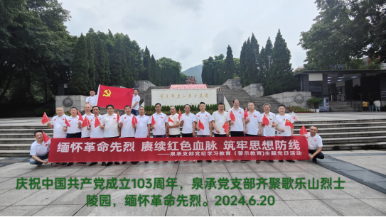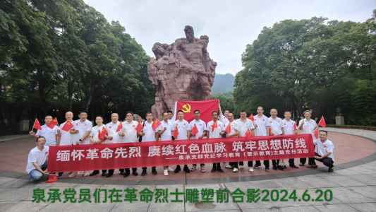 為慶祝中國共產(chǎn)黨成立103周年。在2024年6月20日這天,距7月1日建黨日,還有十天的時(shí)間。泉承黨支部書記、支委、經(jīng)理精心組織安排全體黨員、預(yù)備黨員、入黨積極分子、入黨申請(qǐng)人,統(tǒng)一著雷鋒的士白色短袖、黨員佩戴黨徽,并于當(dāng)日黨員大會(huì)后,齊聚歌樂山烈士陵園、革命紀(jì)念館、白公館等地進(jìn)行了以《緬懷革命先烈賡續(xù)紅色血脈筑牢思想防線》--泉承黨支部黨紀(jì)學(xué)習(xí)教育(警示教育)主題黨日活動(dòng),向先烈們致敬和緬懷。 在這遍曾經(jīng)無數(shù)革命先烈戰(zhàn)斗過的地方,在他們?yōu)樾轮袊闪ⅲ褡濯?dú)立、人民解放,拋頭顱灑熱血的地方,我們駐足,我們哀思。先烈們?yōu)楣伯a(chǎn)主義事業(yè)奉獻(xiàn)出了自己的青春乃至生命。作為新一代共產(chǎn)黨人,我們要牢記他們的英雄事跡,牢記他們?cè)跀橙撕头磩?dòng)派面前,經(jīng)歷了非人的折磨和嚴(yán)刑拷打。但他們始終嚴(yán)守黨的紀(jì)律,就像入黨誓詞里說的:“嚴(yán)守黨的紀(jì)律,保守黨的秘密,對(duì)黨忠誠,積極工作,為共產(chǎn)主義奮斗終生,隨時(shí)準(zhǔn)備為黨和人民犧牲一切,永不叛黨。”誓詞承載著他們對(duì)黨的忠誠,他們用自己的實(shí)際行動(dòng),兌現(xiàn)了對(duì)黨和人民的承諾。 在烈士陵園里,黨員們先后在紅巖魂廣場(chǎng)、烈士紀(jì)念碑前合影留念,只愿時(shí)間、空間能停留一下,這一刻只為緬懷先烈們。歲月的痕跡寫在了同志們的臉上,從小就受到紅色教育的我們,一直不忘初心,牢記使命,沒有革命先烈的犧牲,就不會(huì)換來今天的幸福生活。緬懷先烈,賡續(xù)紅色血脈,是我們每個(gè)人都應(yīng)該去傳承和弘揚(yáng)的。 順臺(tái)階而上我們看到一面面鮮紅的旗幟,其中有中華人民共和國國旗、中國共產(chǎn)黨黨旗、中國人民解放軍軍旗、中國共產(chǎn)主義青年團(tuán)團(tuán)旗、中國少年先鋒隊(duì)隊(duì)旗,都是一樣鮮艷的中國紅,都緊貼著這篇熱血的土地, 五面旗幟匯成一道中國紅的瀑布,意表革命烈士的崇高精神永遠(yuǎn)流傳!