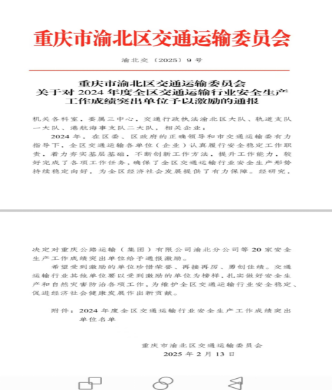 發(fā)表時間:2025-03-12 11:14作者:牛子福來源:協(xié)會 近日,攜華收到渝北區(qū)交通運輸委員會關(guān)于對2024年度全區(qū)交通運輸行業(yè)安全生產(chǎn)成績突出單位予以激勵的通報表揚。該《通報》既是對攜華出行服務(wù)的高度肯定,亦是對攜華人堅守專業(yè)、踐行責任的無聲激勵。