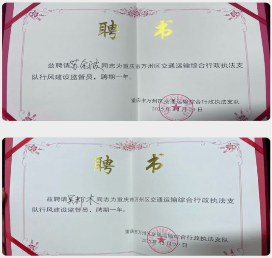 發(fā)表時間:2026-01-04 11:09作者:蘇余波來源:萬州美天 2025年12月29日下午,重慶萬州區(qū)交通運輸綜合行政執(zhí)法支隊舉行了一場意義非凡的行風監(jiān)督員聘任儀式,來自重慶“雷鋒的士·紅巖先鋒隊”第七小組萬州隊員吳邦木、蘇余波等九名同志接過聘書,正式成為綜合執(zhí)法行風監(jiān)督員。這一舉措標志著萬州交通運輸執(zhí)法社會監(jiān)督機制的實質(zhì)性落地,為規(guī)范執(zhí)法行為、提升為民服務質(zhì)效注入強大的社會力量。 此次受聘的九位行風監(jiān)督員,均來自轄區(qū)重點出租客運企業(yè),他們作為一線駕駛員,既熟知行業(yè)發(fā)展實際情況,又精準把握群眾出行訴求痛點,能夠以客觀中立的第三方視角,直擊執(zhí)法工作中的堵點難點,洞察服務過程中的短板不足。在為期一年的聘期內(nèi),他們將身兼“監(jiān)督員、宣傳員、參謀員”三重使命,圍繞執(zhí)法行為規(guī)范、隊伍作風、服務態(tài)度等關鍵維度開展全方位監(jiān)督,及時傳遞社情民意,為交通執(zhí)法工作高質(zhì)量發(fā)展建言獻策。 儀式現(xiàn)場,萬州區(qū)交通運輸綜合行政執(zhí)法支隊向監(jiān)督員們詳細解讀了工作職責清單與聯(lián)絡溝通機制,明確監(jiān)督員可通過明察暗訪、現(xiàn)場見證執(zhí)法、座談交流等多種方式,靈活高效地履行監(jiān)督職能。同時,支隊鄭重承諾將建立快速響應與閉環(huán)管理機制,確保監(jiān)督員提出的每一條意見建議都能得到回應、落實,切實發(fā)揮監(jiān)督實效。 聘任行風監(jiān)督員,是萬州交通執(zhí)法支隊踐行以人民為中心發(fā)展思想、深化作風紀律建設、維護運輸市場穩(wěn)定有序發(fā)展的重要舉措。通過引入社會監(jiān)督力量,不僅能督促執(zhí)法人員嚴格規(guī)范自身行為、改進工作作風,還能搭建起執(zhí)法部門與群眾之間良性互動的“連心橋”,讓執(zhí)法工作更接地氣、更有溫度、更見實效,為萬州創(chuàng)建全國文明城市添磚加瓦。