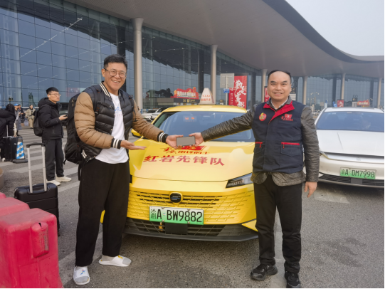 大概20分鐘,尹成兵又重新回到T3航站樓出發(fā)層五號門,遠(yuǎn)遠(yuǎn)地看見兩位等在那里的乘客。當(dāng)看到我開著雙閃慢慢靠近,他們興奮地朝我揮手,其中一位乘客拿起后排座位上面的手機,嘴里不停地說著“謝謝”!作為雷鋒的士駕駛員,尹成兵婉拒了乘客的酬謝。為了定格這一美好的愉快的回憶,我們愉快地拍照留念。分別的時候,友誼的雙手緊緊的握在一起,就像許久不見的老朋友一樣,有一種依依不舍的感覺。