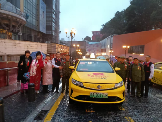 圖為:重慶“雷鋒的士”美天支隊(duì)在指定地點(diǎn)等候抗美援朝老兵上車