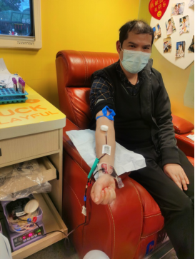 圖為泉承優(yōu)秀黨員盧忠軍同志正在觀音橋獻(xiàn)血車上進(jìn)行無償獻(xiàn)血。