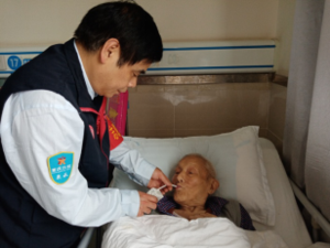 發(fā)表時(shí)間:2021-03-18 14:34作者:文/圖3 羅國(guó)華來(lái)源:泉承 在開展3月學(xué)雷鋒月活動(dòng)中的3月17日下午,重慶泉承黨支部第二黨小組的幾名黨員、入黨積極分子和入黨申請(qǐng)人也是優(yōu)秀雷鋒隊(duì)員同志們,在黨小組組長(zhǎng)盧忠軍同志的組織和帶領(lǐng)下,身著“雷鋒的士”隊(duì)員馬甲,臂帶泉承大隊(duì)雷鋒志愿服務(wù)隊(duì)員的臂章,手提袋裝大米,盒裝牛奶,桶裝食用油及香蕉、橘子水果等物品,前往兩江新區(qū)第一人民醫(yī)院住院部去看望一位年歲已是111高壽的柯瑞林老爺爺,充分展現(xiàn)了泉承支部黨員入黨積極分子、入黨申請(qǐng)人和雷鋒隊(duì)員同志們,積極開展3月學(xué)雷鋒月志愿服務(wù)活動(dòng)的精神和行動(dòng),把雷鋒精神灑滿柯老爺爺?shù)牟》坷铮?/span>受到111歲高壽柯爺爺及陪伴照料他的周阿姨的好評(píng)和感謝! 在病房里,大家在看望躺著病榻上的柯爺爺時(shí),大家熱情地分別握著柯爺爺?shù)氖郑瑔?wèn)候著柯爺爺,柯爺爺是因肚腹有點(diǎn)疼痛病而入住醫(yī)院的。 大家親切而熱情地問(wèn)候著柯爺爺?shù)纳眢w,優(yōu)秀雷鋒隊(duì)員王華倫同志拿著餐巾紙輕輕地擦拭著柯爺爺?shù)淖齑剑瑑?yōu)秀雷鋒隊(duì)員邱小波同志拿著一只剝皮厚的香蕉慢慢喂進(jìn)柯爺爺?shù)淖炖铮h小組組長(zhǎng)盧忠軍同志拉著柯爺爺手撫摸著......。 大家親熱地與柯爺爺進(jìn)行著談話交流,有說(shuō)有笑,面對(duì)病榻上非常高興的柯爺爺,大家都對(duì)于有著111歲高壽的柯爺爺?shù)木衩婷玻哉勁e止,意識(shí)反應(yīng)、手、耳、眼、嘴等也非常自如,完全超越過(guò)他的高壽年齡時(shí)段的狀態(tài)而感到非常驚訝!大家紛紛贊許柯爺爺,真是太不容易了!大家真為柯爺爺感到驕傲,都紛紛拉著、撫摸著柯爺爺?shù)氖郑硎緸樽约涸鎏硌幽暌鎵邸⒉?/span>表示一定要向柯爺爺那樣始終保持一顆良好的心態(tài)、不斷促進(jìn)自己幸福健康,快樂(lè)生活!
