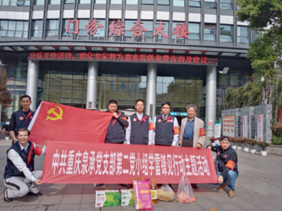 圖為泉承支部第二黨小組的黨員、雷鋒隊(duì)員在兩江新區(qū)第一人民醫(yī)院大門前合影留念