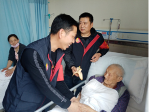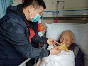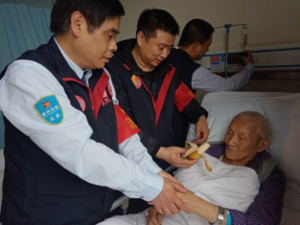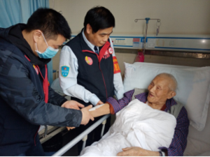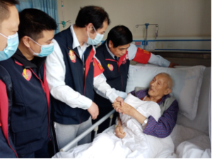 圖為黨員、雷鋒隊(duì)員同志們手提慰問(wèn)物品前往兩江新區(qū)第一人民醫(yī)院看望正在生病住院的111高壽年齡的柯瑞林老爺爺